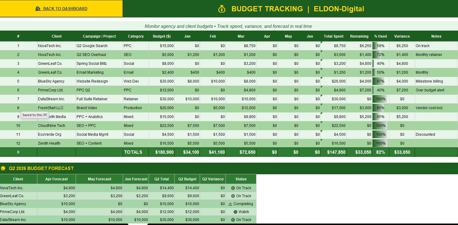 π° Budget Tracker β Monitor client budgets month by month. Variance, % used, remaining budget, and Q2 forecasts are all formula-driven. Over-budget rows flag automatically.