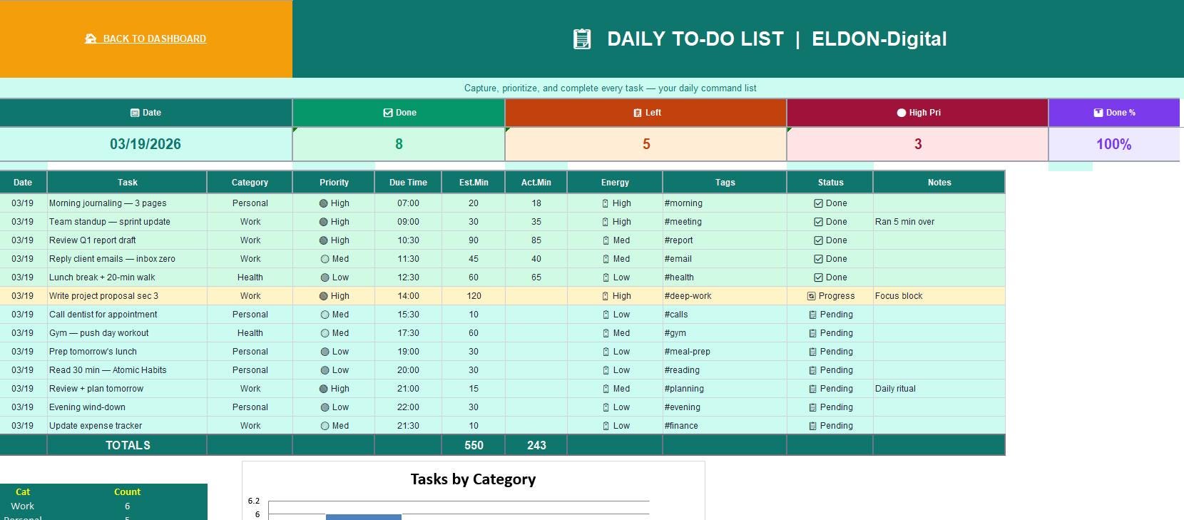 π Daily To-Do List -Capture every task for the day with category, priority (π΄ High / π‘ Med / π’ Low), due time, estimated minutes, actual minutes, energy level, and tags. Color-coded rows instantly show Done (π’), In Progress (π‘), and Pending (π΅). Estimated vs actual time comparison helps you improve future planning. Total minutes auto-sum at the bottom.