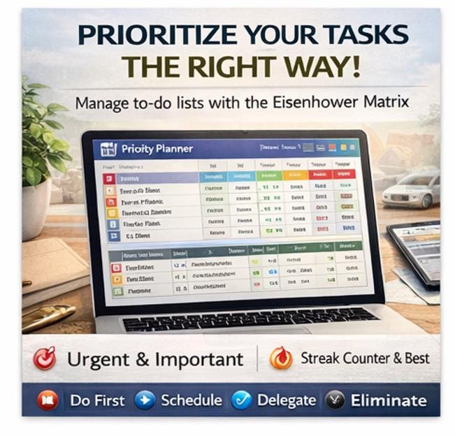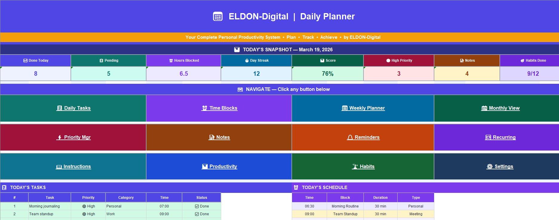 Stop losing track of your day. This professionally designed, fully automated Excel workbook gives you everything you need to organize your tasks, block your time, track your habits, manage priorities, and review your productivity -all in one beautiful, light colorful system by ELDON-Digital.