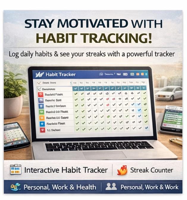 β¨ 601 live formulas -Completion rates, time totals, habit percentages, efficiency scores, and calendar dates all auto-calculate π 25 navigation hyperlinks -Click any button to jump between all 14 modules instantly π 13 built-in charts -Bar, line, and pie charts in every data module π