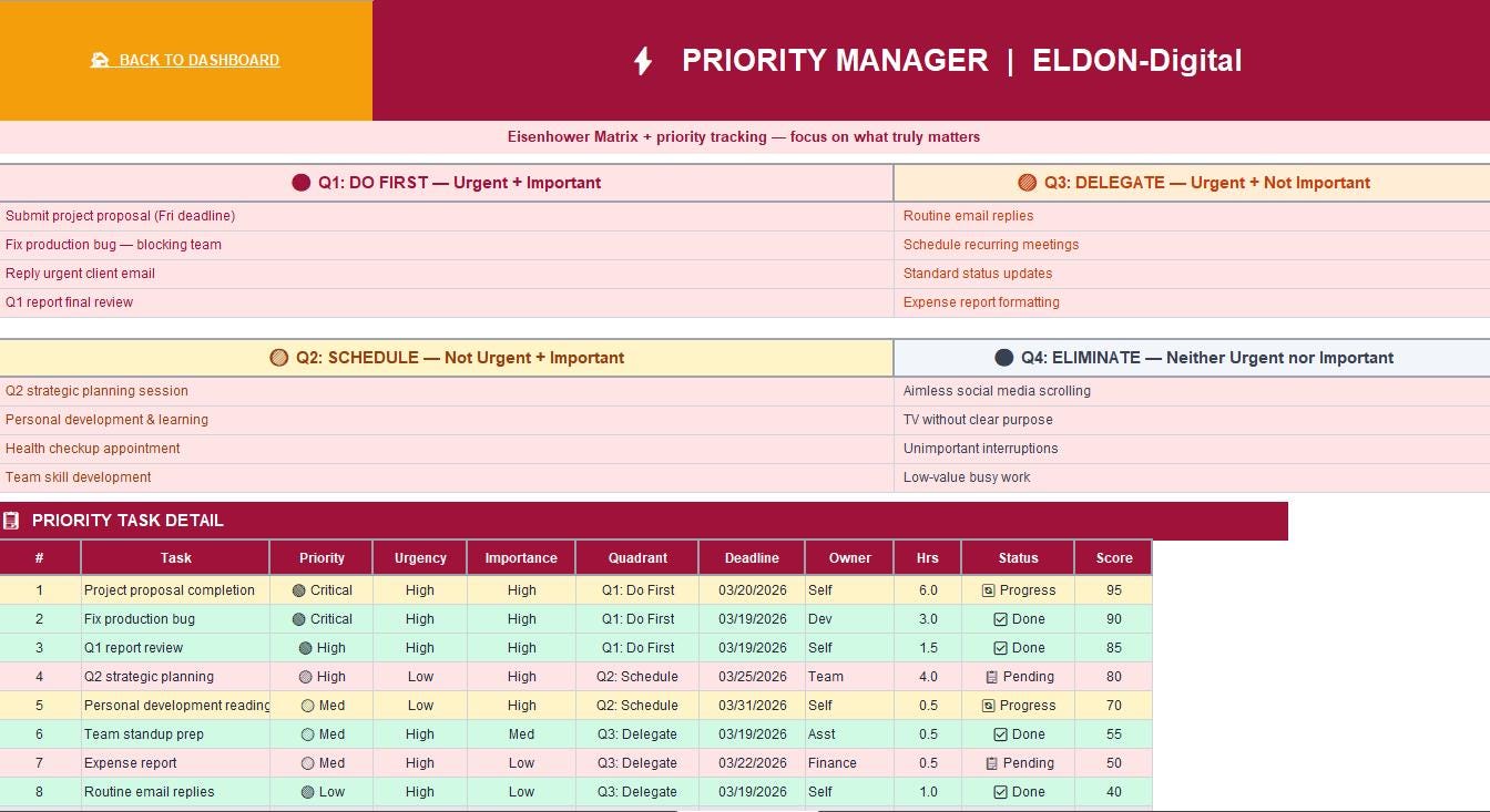 β‘ Priority Manager -Built on the Eisenhower Matrix framework: Quadrant 1 (Do First π΄), Quadrant 2 (Schedule π‘), Quadrant 3 (Delegate π ), Quadrant 4 (Eliminate β«). Below the matrix, a detailed priority task list tracks urgency, importance, quadrant assignment, deadline, owner, estimated hours, status, and value score. Includes a priority distribution pie chart.
