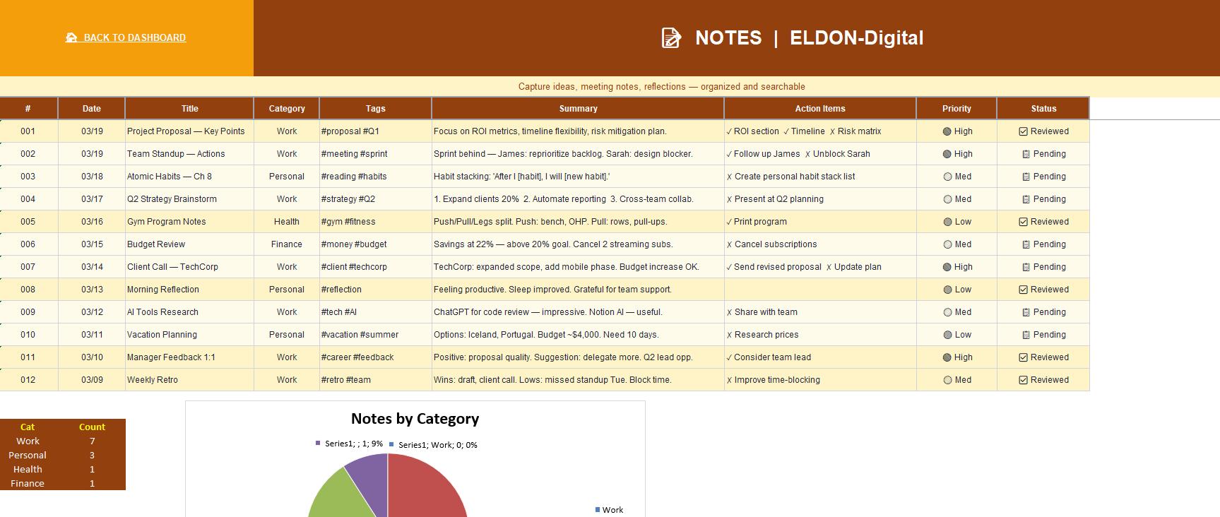π Notes Section -A structured note-taking system with date, title, category, tags, content summary, action items (using β/β notation), priority, and review status. Tag-based organization makes anything searchable with Ctrl+F. 12 sample notes pre-loaded across Work, Personal, Health, and Finance categories.