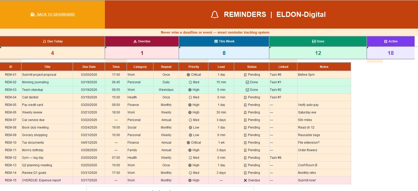 π Reminder System -Never miss a deadline again. Log every reminder with due date, due time, category, repeat frequency (Daily/Weekly/Monthly/Annual/Once), priority, lead time, and linked task. Color-coded by status -β