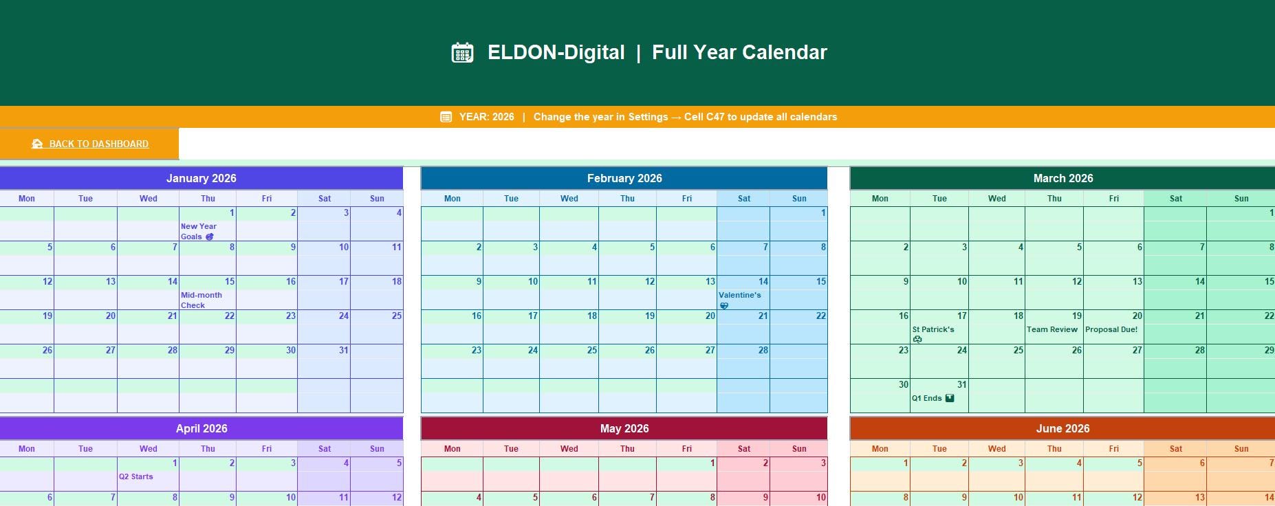 π Full Year Calendar (All 12 Months) -A complete yearly calendar with all 12 months visible on one sheet, each with its own unique color theme. Every date calculates automatically using Excel formulas. Each day has a free-text note row where you can type events, appointments, reminders, or anything you need -no pop-ups, no restrictions. Pre-loaded with 24 annual events (holidays, quarter ends, seasonal markers). Change one cell in Settings (the year) and every calendar updates instantly -works for any year from 2024 to 2035.