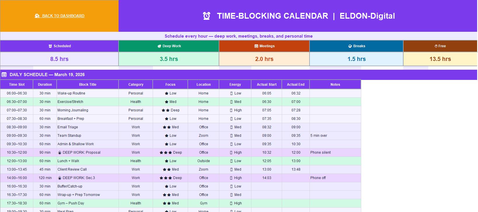 β° Time-Blocking Calendar -Schedule every hour of your day in focused time blocks with category, focus level (β Low / ββ Med / βββ Deep Work), location, energy required, and actual start/end times. Deep work blocks are highlighted in a distinct color. Includes a 7-day Weekly Time Allocation stacked bar chart showing hours by Work, Health, and Personal categories.