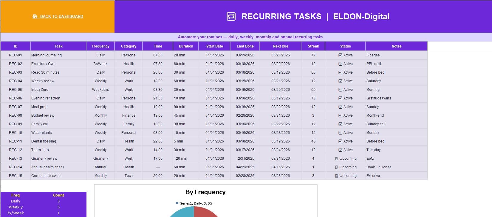 π Recurring Tasks -Register all your habits and routines -daily, 3x/week, weekly, monthly, quarterly, annual. Track Start Date, Last Done, Next Due, and Streak for each one. 15 pre-loaded recurring tasks across Personal, Work, Health, Finance, and Family categories. Includes a frequency distribution pie chart.