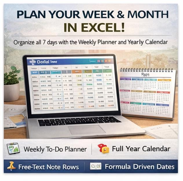 8 non-blocking date helpers -Calendar shows on every date field without ever blocking your input ποΈ Full year calendar -all 12 months -Each with a unique color theme and formula-driven dates β‘ 1-cell year control -Change Settings!C47 from 2026 to any year and all 12 calendars update instantly βοΈ Free-text note rows -Type any text in calendar days -no validation popups or restrictions π₯ Streak tracking -Habit and recurring task streak counters to build consistency π¨ 14 unique color themes -Every sheet has its own light colorful palette -easy on the eyes and beautiful π Mock data pre-filled -See every module in action immediately with realistic sample data π Zero formula errors -Verified with LibreOffice full recalculation across all 601 formulas β‘ Works in Microsoft Excel 2016, 2019, 2021, 365 -PC & Mac compatible
