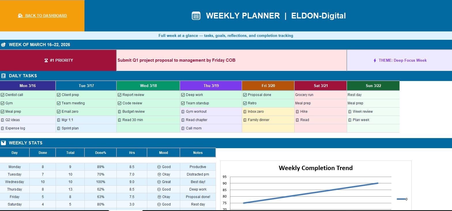 Weekly Planner -Plan your full week at a glance with a 7-column daily task grid. Set your #1 Priority and Weekly Theme at the top. Track daily stats -tasks done, total, completion %, hours worked, and mood -with a weekly completion trend line chart. Color-coded by day of week for instant visual orientation.
