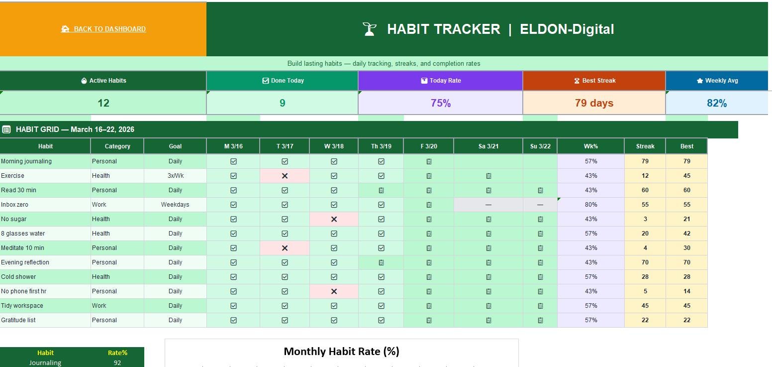 (done), β (missed), π (upcoming) marking for up to 12 habits. Week % auto-calculates for each habit. Track streak counts and personal bests. 12 pre-loaded habits across Personal, Health, and Work categories. Includes a monthly habit completion rate bar chart.