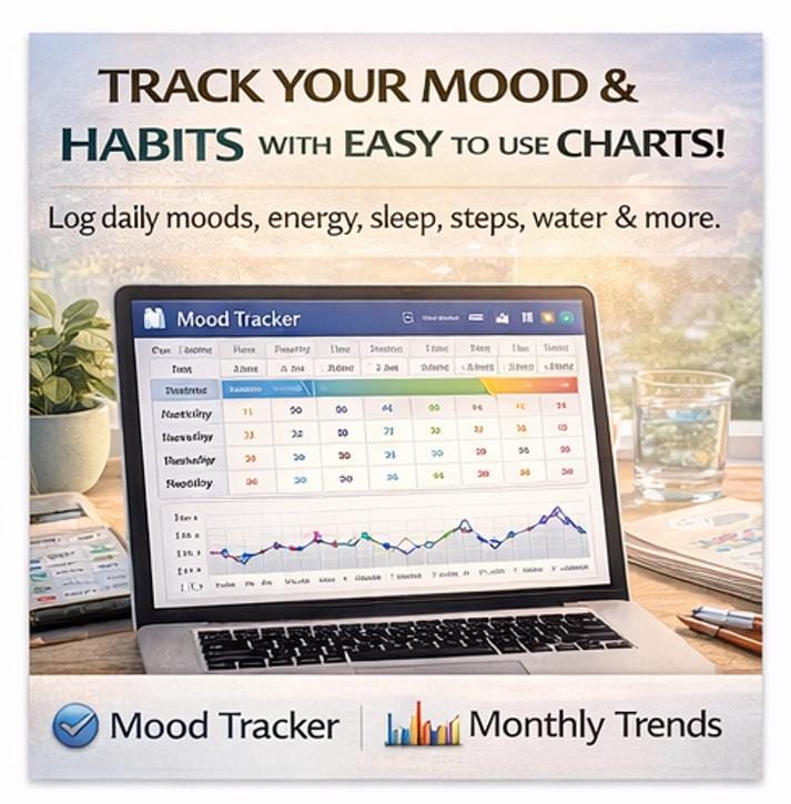π Mood Tracker -Log your daily mood, energy (1β10), stress (1β10), sleep hours, water intake, steps, and gratitude notes. Watch your emotional patterns over time with color-coded scores.