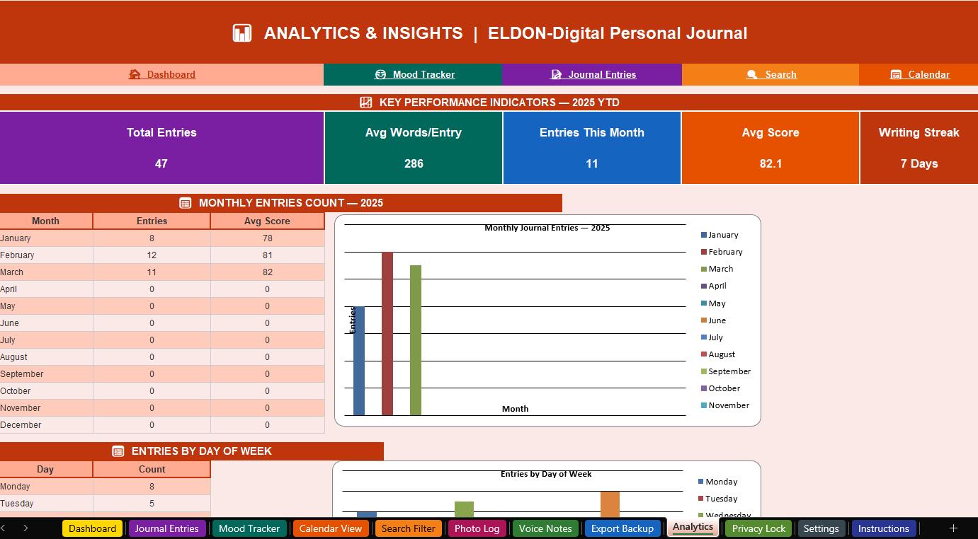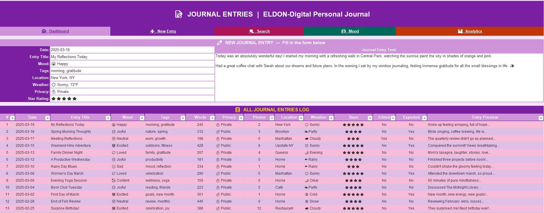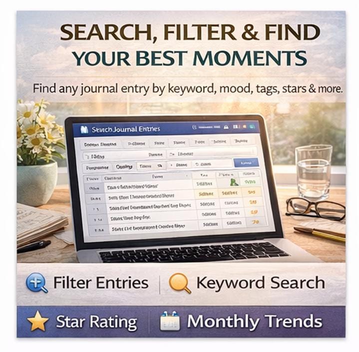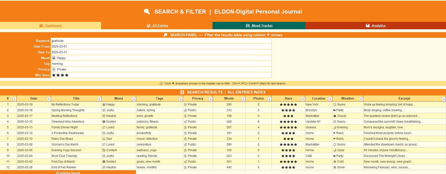 π Search & Filter -Find any entry by keyword, date range, mood, tag, privacy level, or star rating using powerful Excel AutoFilter dropdowns.