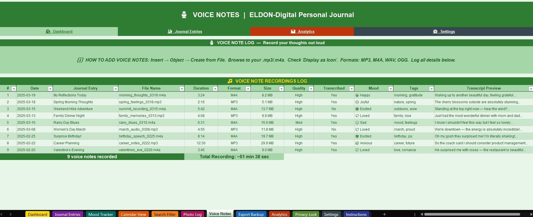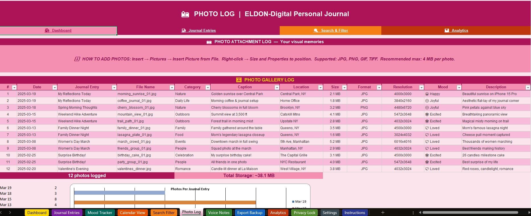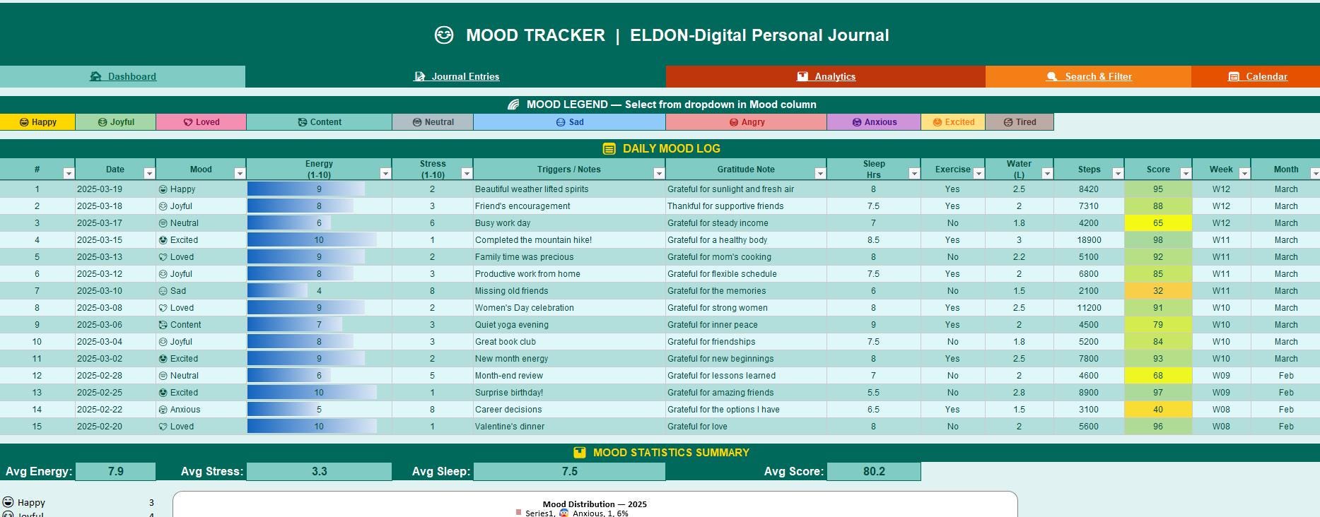 π Search & Filter -Find any entry by keyword, date range, mood, tag, privacy level, or star rating using powerful Excel AutoFilter dropdowns.