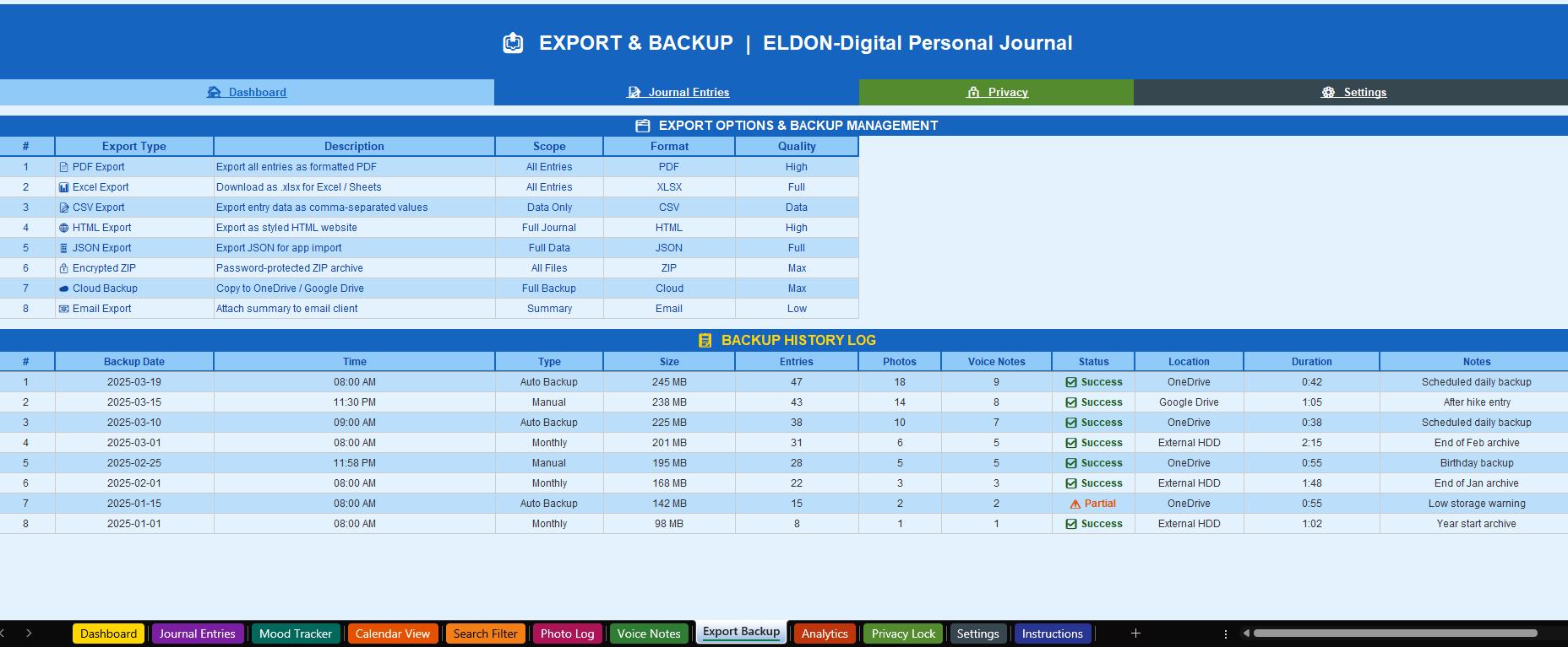 π€ Export & Backup -Track your backup history and access step-by-step export guides for PDF, Excel, CSV, HTML, JSON, and cloud backup.