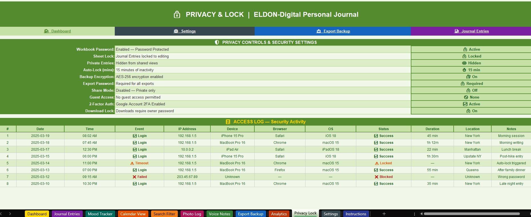 π Privacy Controls -Mark entries as Private, Public, or Shared. Hide rows, set workbook passwords, and review your access log