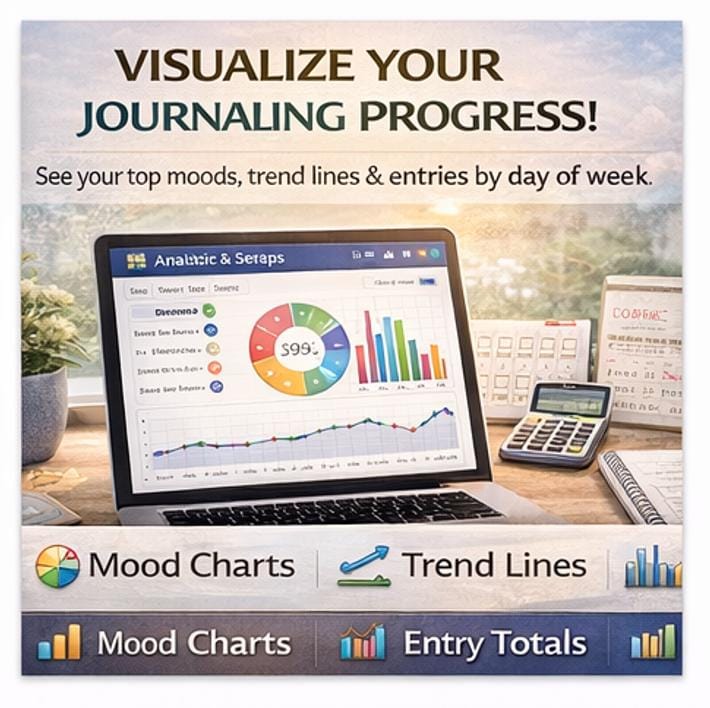 π Analytics & Insights -Stunning charts showing your monthly entry count, mood distribution pie chart, entries by day of week, and mood score trend line. π