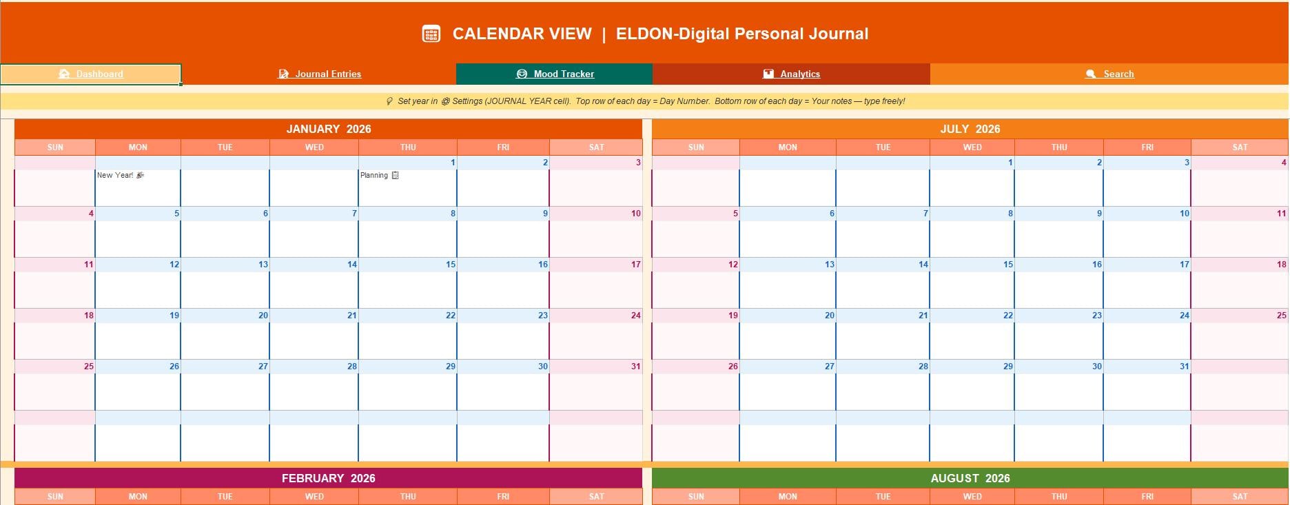 Full-Year Calendar View -A beautiful 12-month calendar showing ALL months side by side. Set your year once in Settings and every single month auto-updates instantly! Each day has a compact number row + a spacious writing row for your notes. ποΈ