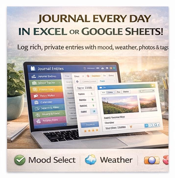 This is a fully-featured Personal Journal Application built inside Microsoft Excel AND Google Sheets -two files in one purchase! It's a beautifully designed, color-coded digital diary system with 12 interactive modules, all connected through a gorgeous navigation dashboard. Whether you're a daily journaler, a mood tracker, a memory keeper, or just starting your self-reflection journey, this template has everything you need in one place. π