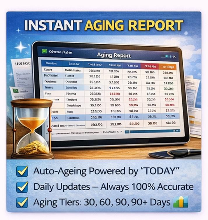 β± Aging Report -This is the sheet that saves you hours every month. π Aging bands are calculated automatically using Excel's TODAY() function -meaning your aging report updates itself every single day without you touching anything. Invoices are auto-classified into: Current β 1-30 Days β 31-60 Days β 61-90 Days β 90+ Days overdue. Five KPI cards at the top show the total dollar amount in each aging bucket instantly.
