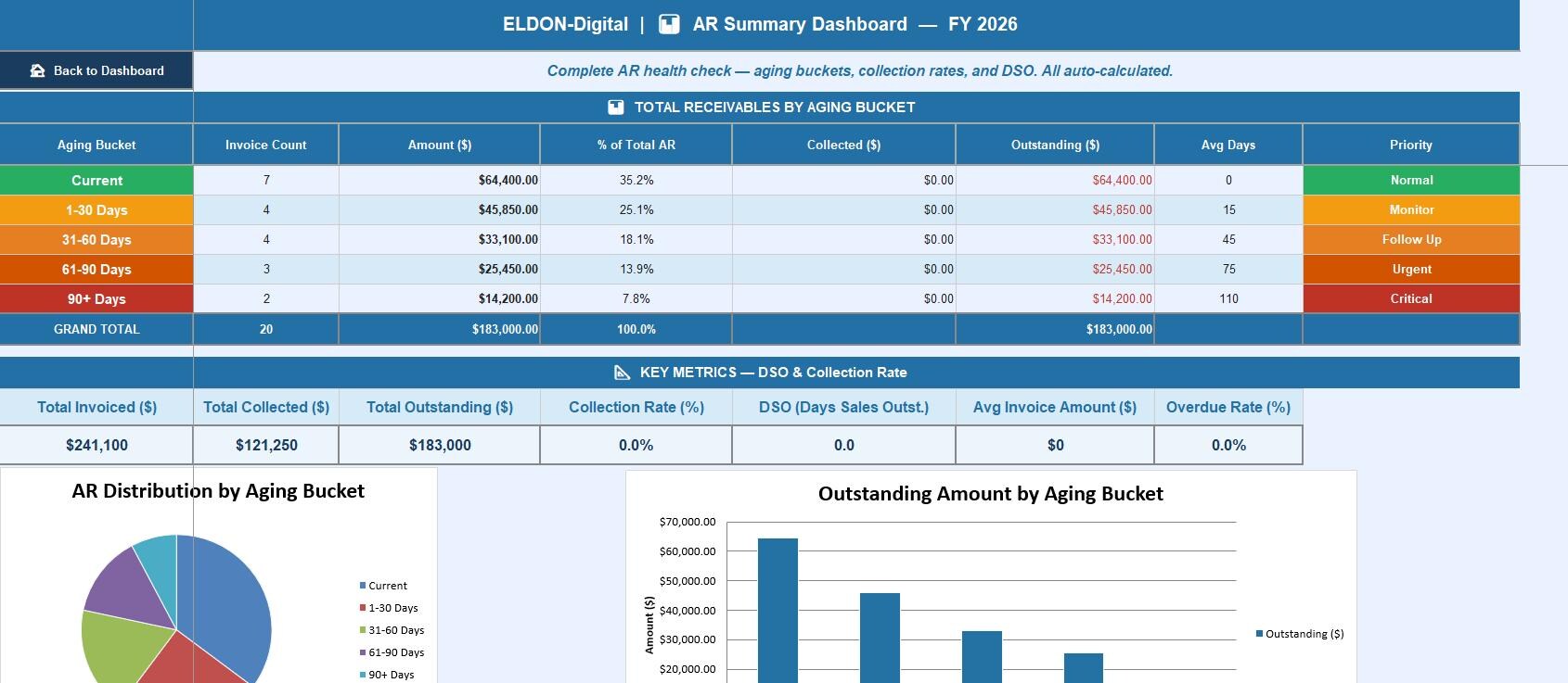 π AR Summary Dashboard -Complete accounts receivable health check in one place. Shows total receivables by aging bucket, collection rate percentage, DSO (Days Sales Outstanding), average invoice amount, and overdue rate. Two charts -a pie chart for AR distribution and a bar chart for outstanding amounts -give you visual clarity in seconds.