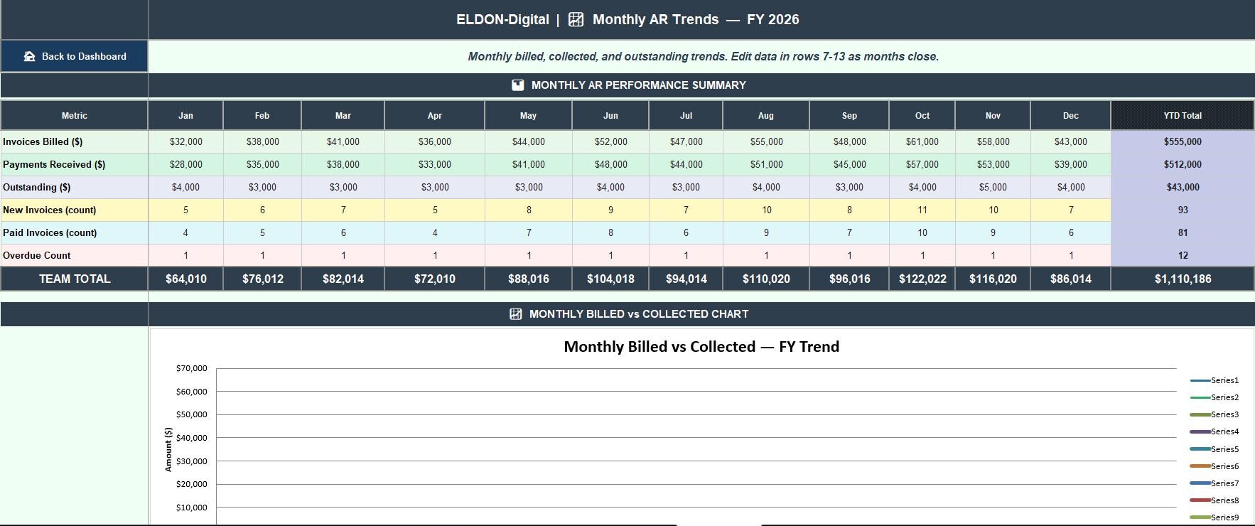 π Monthly Trends -12-month AR performance tracking showing monthly billed, collected, outstanding, new invoice count, paid invoice count, and overdue count. Two professional charts: a line chart comparing monthly billed vs. collected, and a bar chart showing the monthly outstanding AR trend. Perfect for board presentations and quarterly business reviews.