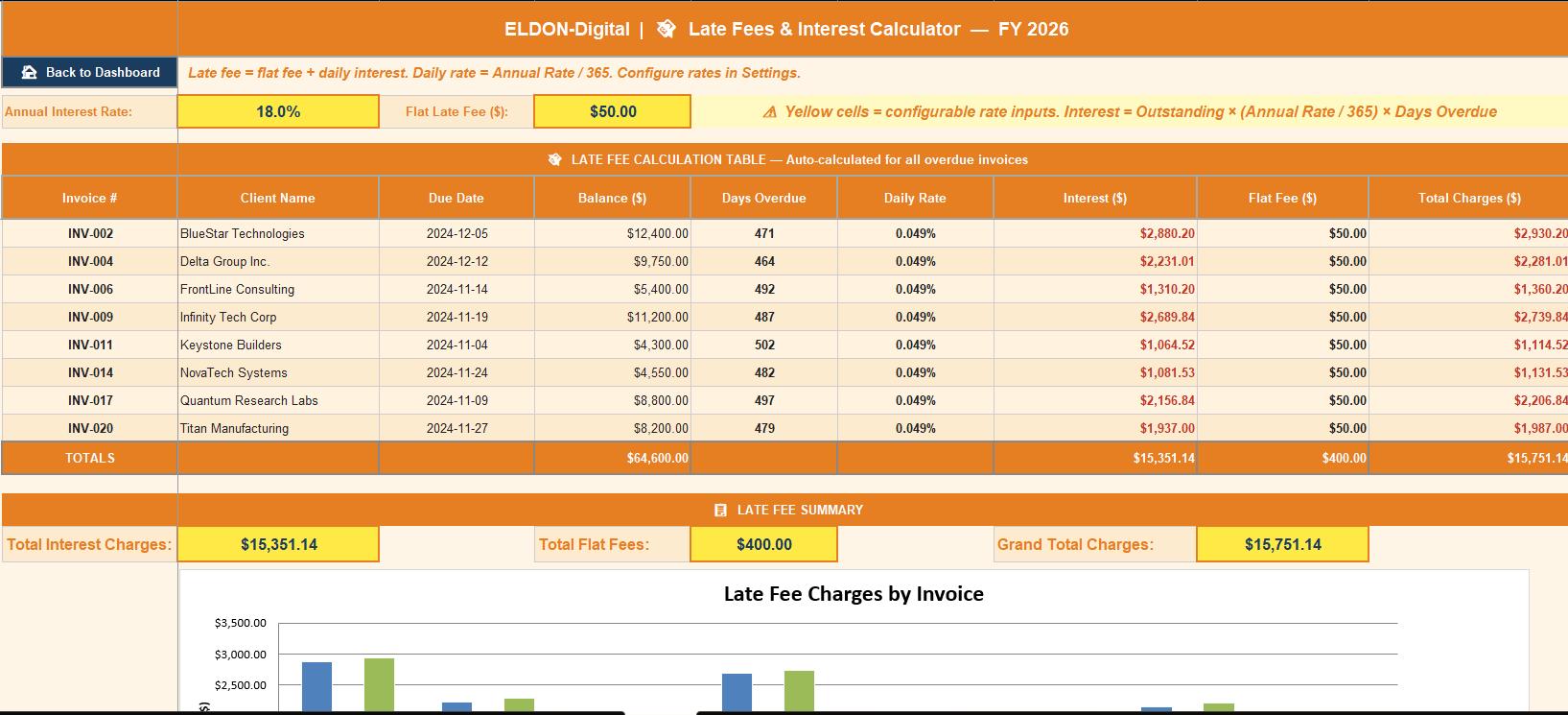 πΈ Late Fees & Interest Calculator -Automatically calculates interest charges and flat late fees for every overdue invoice. The formula is: Interest = Outstanding Balance Γ (Annual Rate Γ· 365) Γ Days Overdue. The Annual Interest Rate (default 18%) and Flat Late Fee ($50) are in bright yellow editable cells -change them in seconds to match your company policy. Everything recalculates instantly. β‘