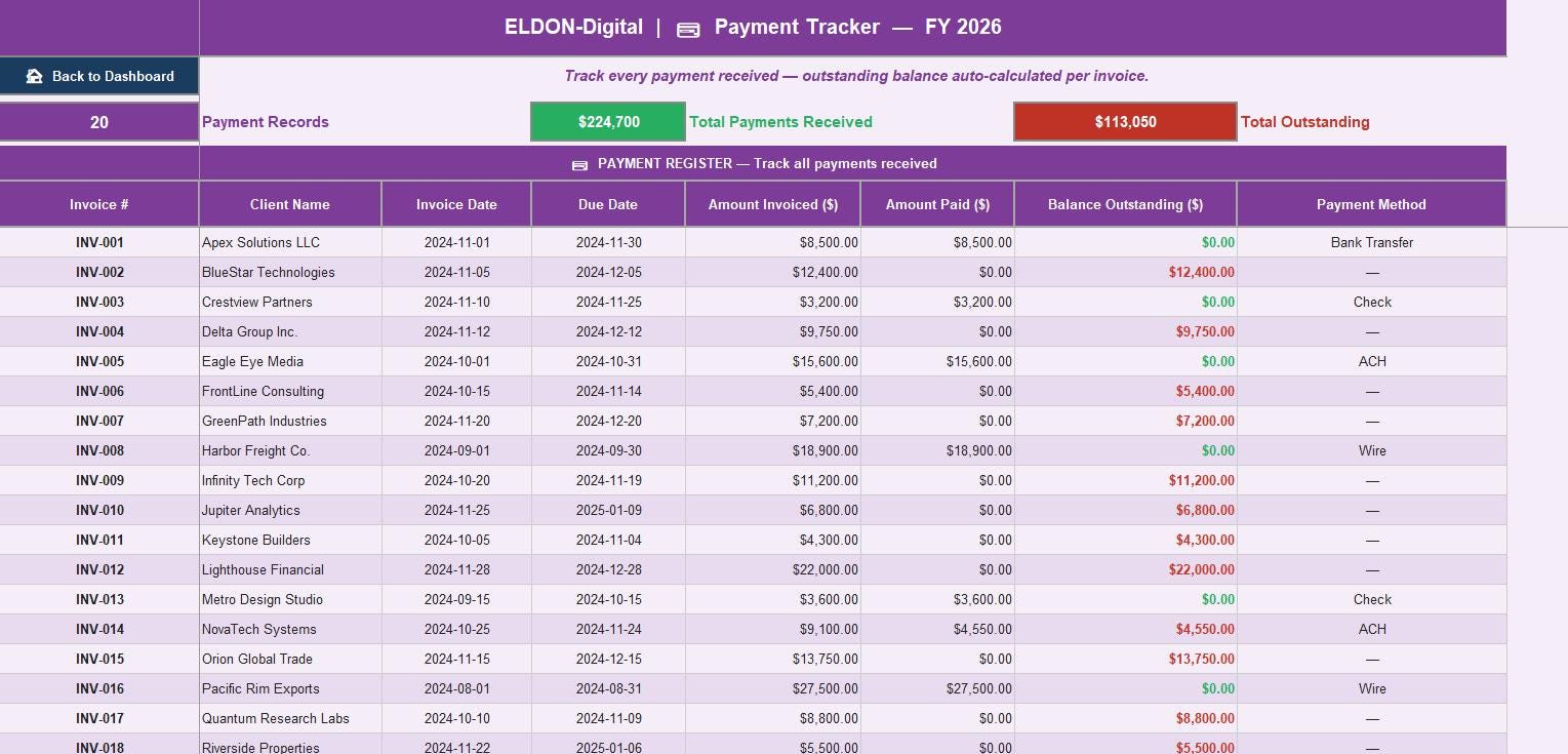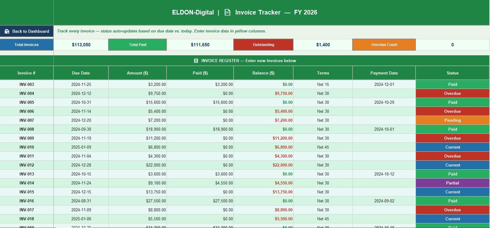 π Invoice Tracker -The core of the system. Log every invoice with invoice number, client name, invoice date, due date, amount billed, payment received, and payment terms. The outstanding balance calculates automatically. Status badges auto-color: β