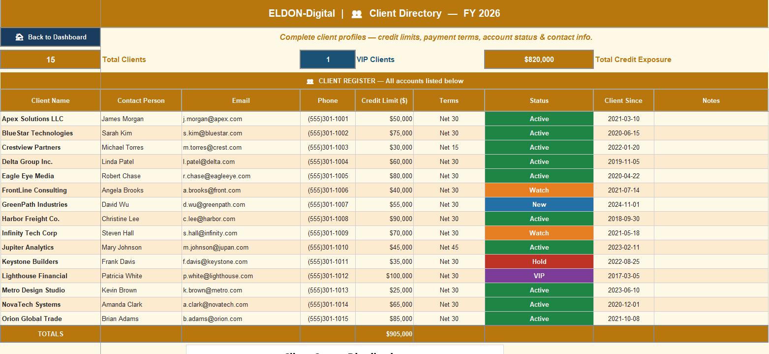 π₯ Client Directory -Complete client profiles with contact person, email, phone, credit limit, payment terms, and account status. Status badges color-code clients as Active, VIP, New, Watch, or Hold. Includes a pie chart showing your client portfolio breakdown at a glance.