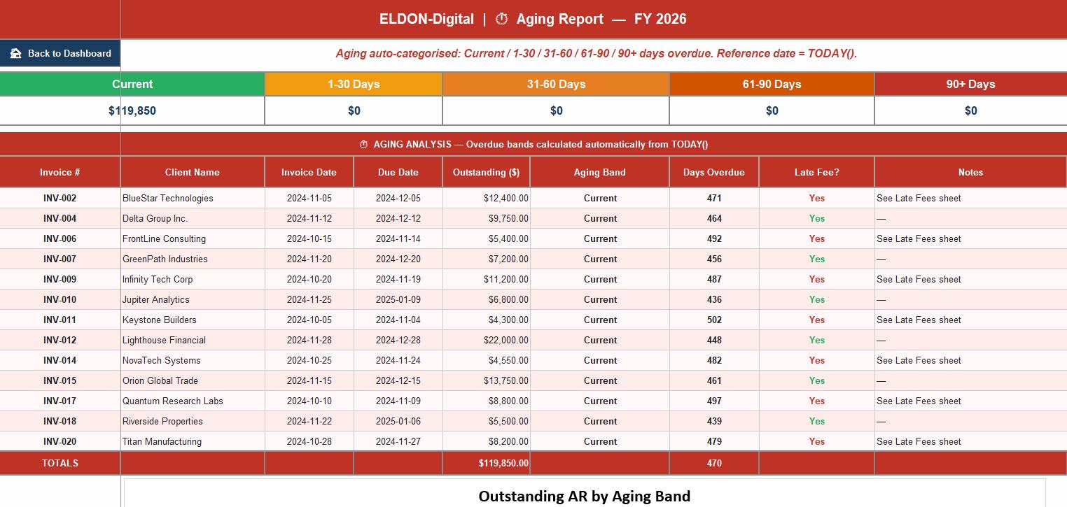 Date picker validation on all date input cells across 5 sheets π Yellow = input Β· Green = auto-calculated Β· Red = alert -clear visual system π COUNTIF / SUMIF / RANK / TODAY() -advanced formulas used throughout π DSO calculation -Days Sales Outstanding auto-calculated π’ Aging bands -5-tier auto-classification with dollar totals per bucket π§Ύ 20 sample invoices + 15 clients -full mock data pre-loaded for demo π€ Instant download -ready to use the moment you open it
