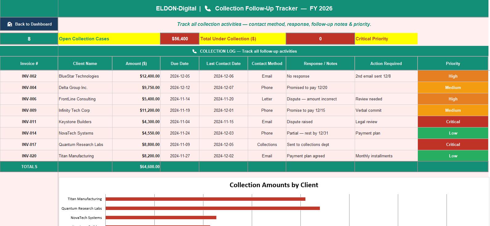π Collections Follow-Up Tracker -Never let a collection slip through the cracks again. Log every collection activity: client, invoice, contact date, contact method (Email / Phone / Letter / Collections), response received, action required, and priority level. Priority badges auto-color: π΄ Critical (red), π High (orange), π‘ Medium (amber), π’ Low (green).