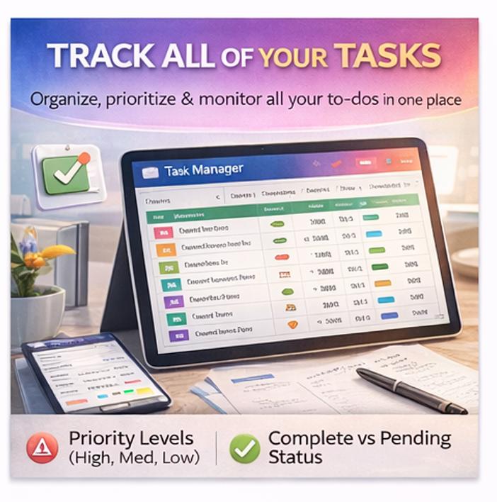 3. Task Manager Never forget a task again! Track up to 50+ tasks with: β