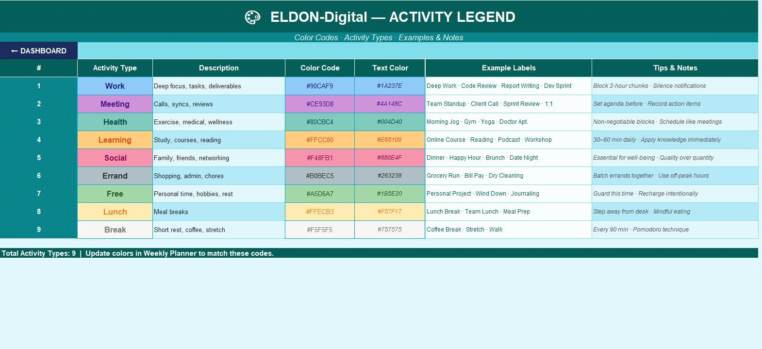 π¨ 6. Activity Legend Your color-code reference guide! 9 built-in activity types -each with: β