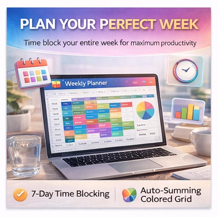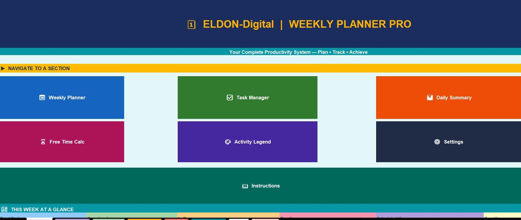 β¨ STOP letting your week run YOU. This professionally designed, color-coded Weekly Planner spreadsheet gives you total control over your time, tasks, and goals -all in one stunning, ready-to-use digital file. Built by ELDON-Digital, this is not your average planner. It's a full productivity command center. πͺ