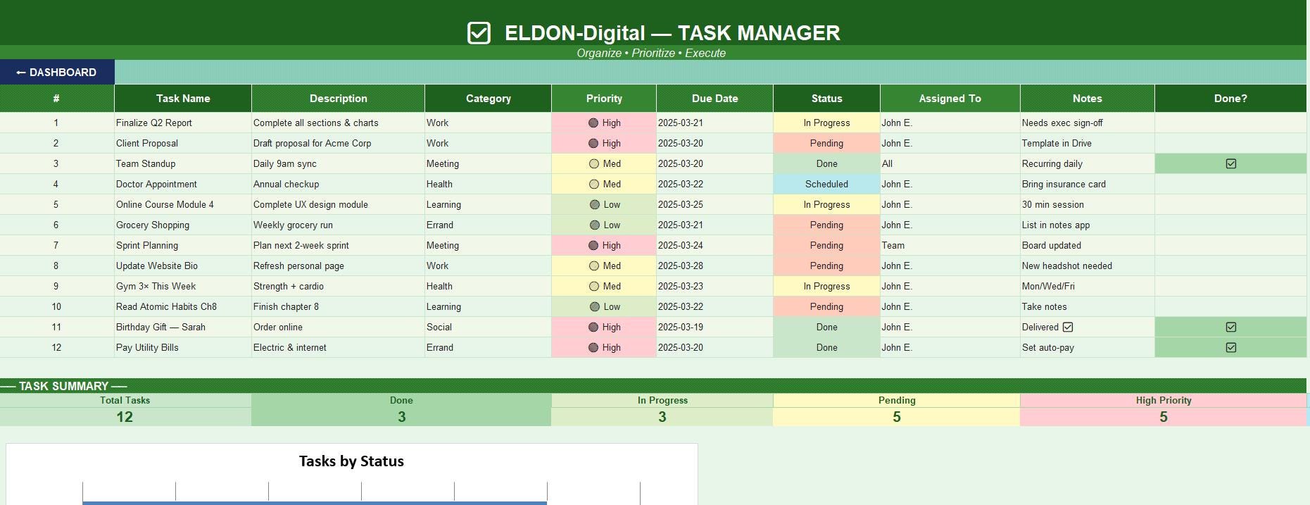DASHBOARD" button to navigate back instantly ποΈ Built-in calendar date picker on all date cells -no typing dates manually! π 3D-style charts embedded directly in relevant sheets π‘ Pre-filled with realistic mock data so you can see exactly how it looks in use π Zero formula errors -every formula has been fully audited and verified