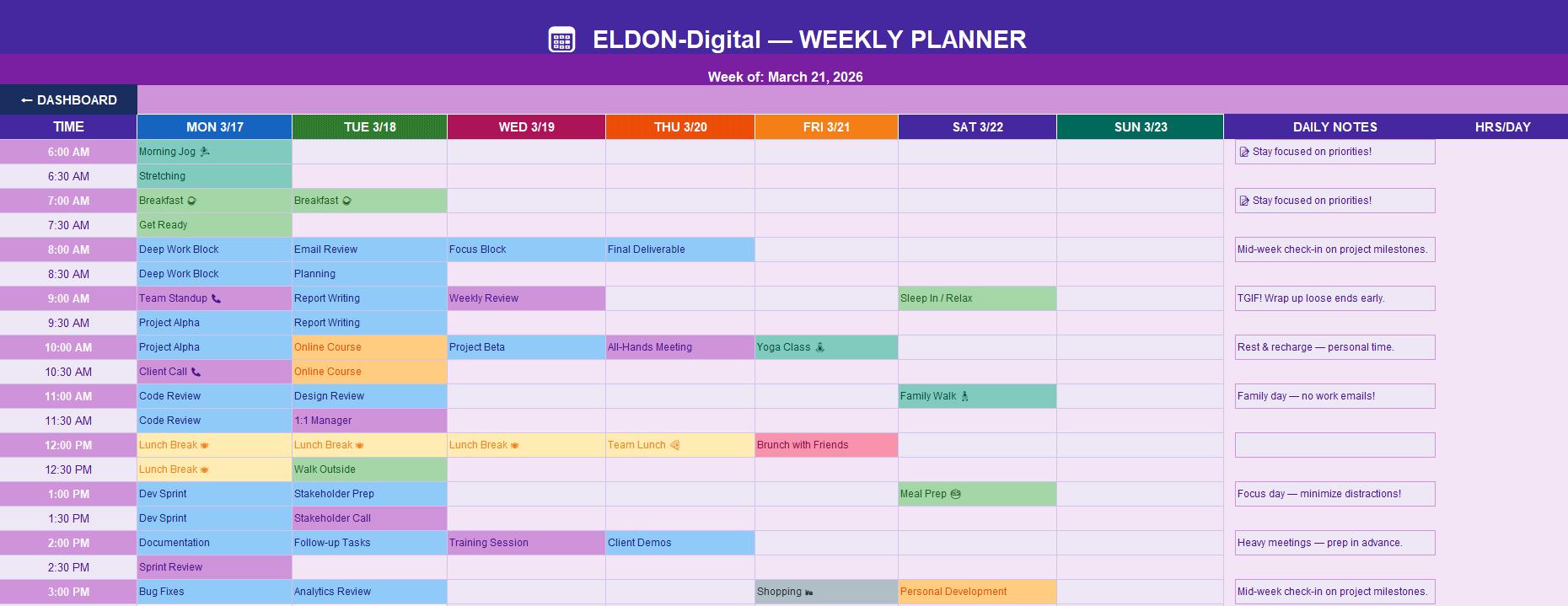 2. Weekly Planner (7-Day Time-Block Grid) The heart of the system! A full 6:00 AMβ10:00 PM time-block grid covering Monday through Sunday in 30-minute slots. Color-coded by activity type for instant visual clarity. Includes: β