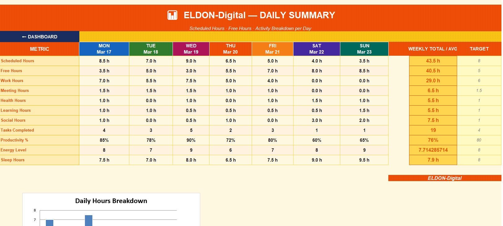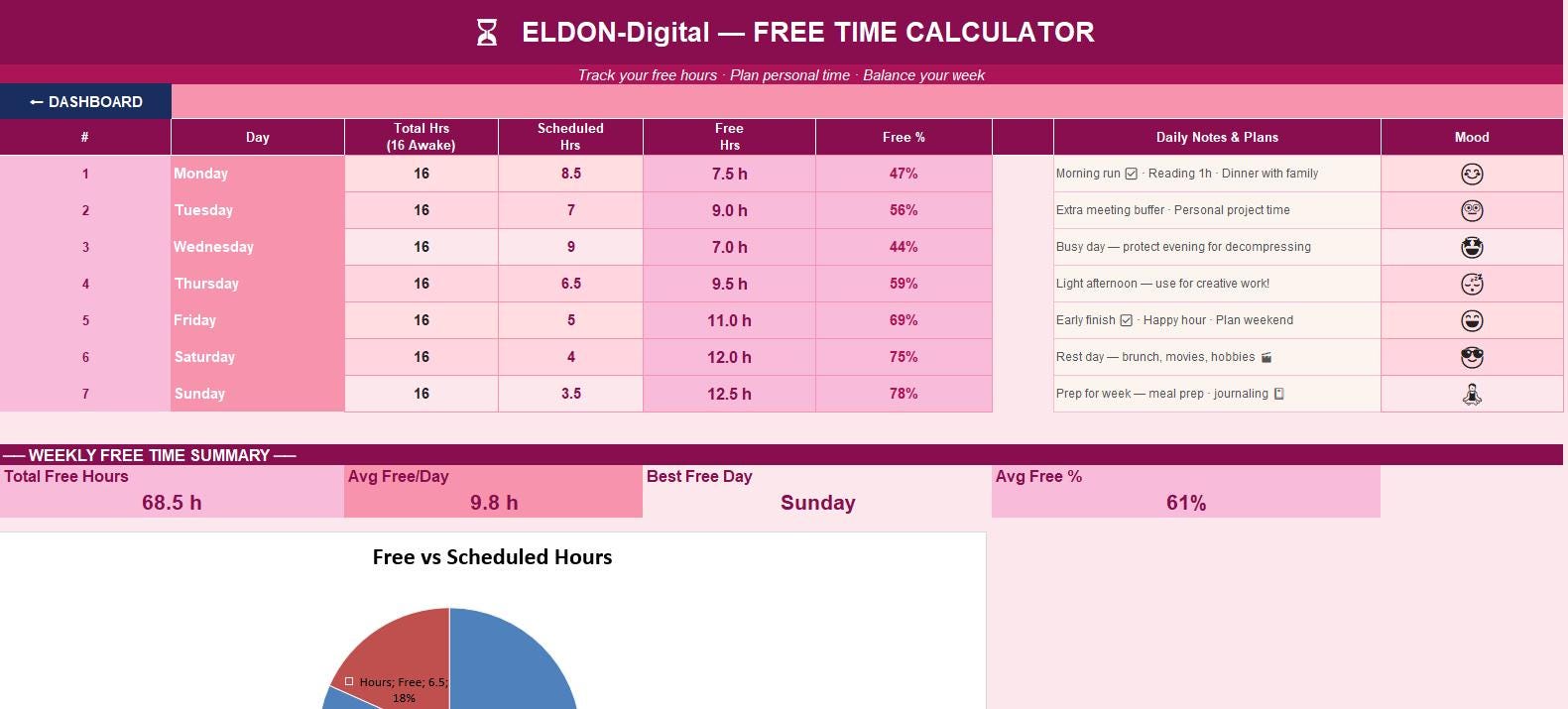 π 1. Dashboard Your command center! A beautiful, branded navigation hub with one-click buttons to jump to any section instantly. View your weekly stats at a glance -tasks completed, scheduled hours, free time, and more. π