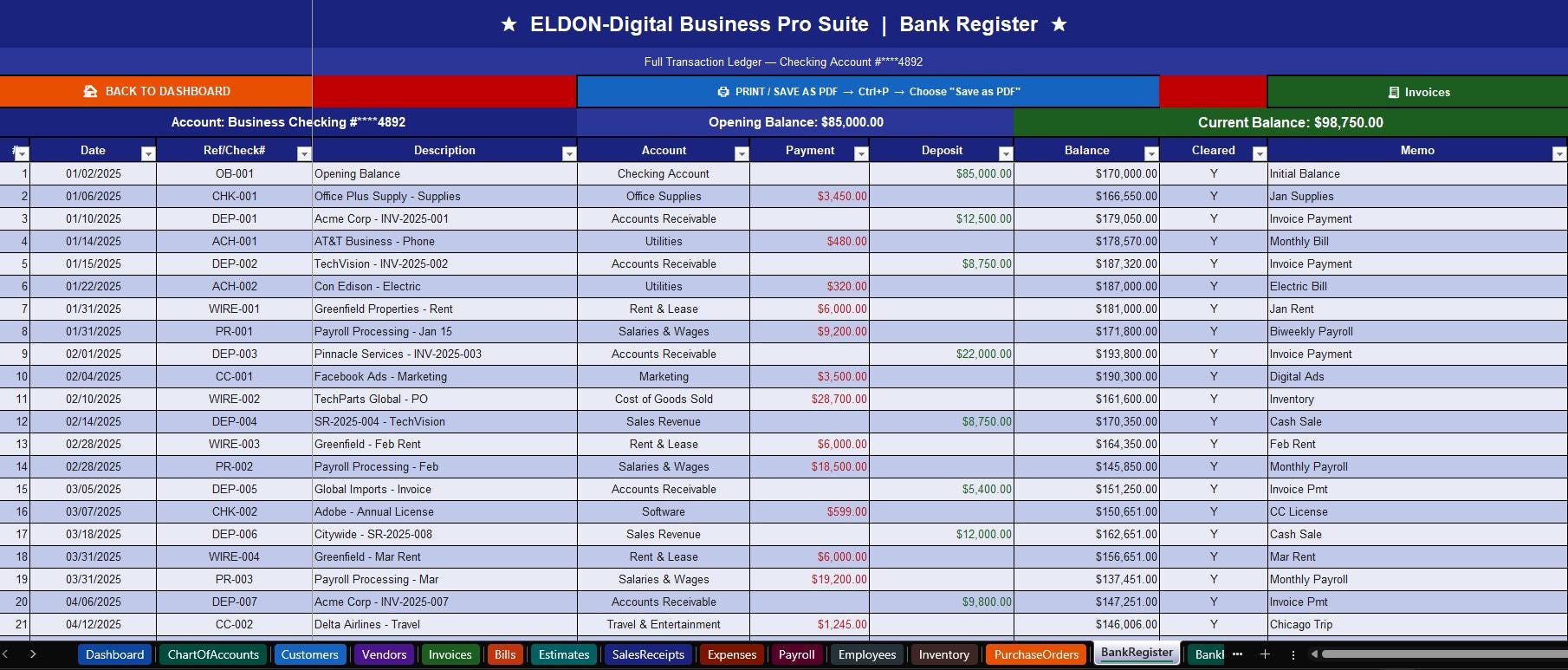 ๐ฆ Bank Register -Full 29-transaction ledger with running balance