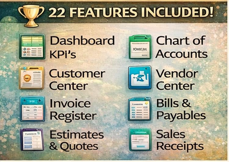 ๐ Dashboard -Your financial command center with live KPIs, total revenue, expenses, net income, accounts receivable, and cash balance -all updating automatically. Clickable navigation buttons take you to any sheet instantly.