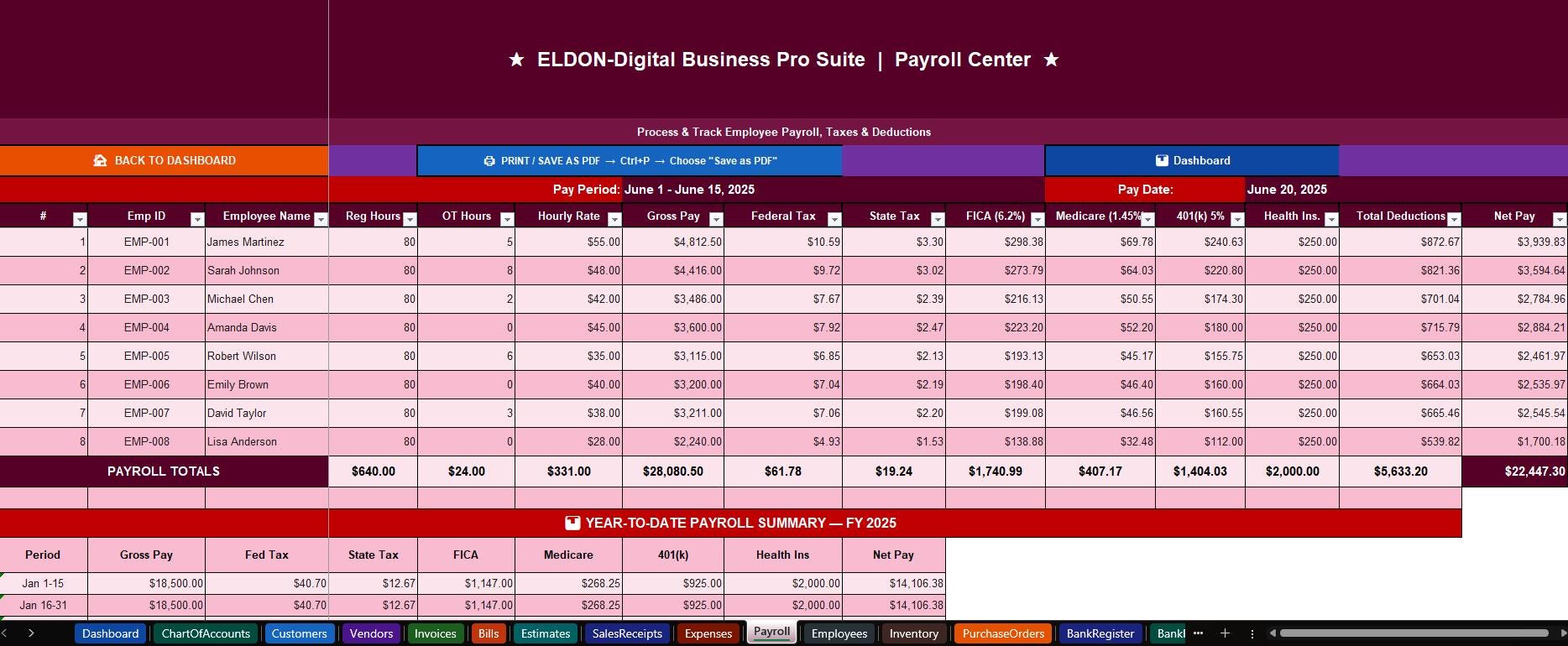 ๐ผ Payroll Register -Process payroll for 8 employees with auto-calculated federal tax, state tax, FICA, Medicare, 401(k), and health insurance deductions