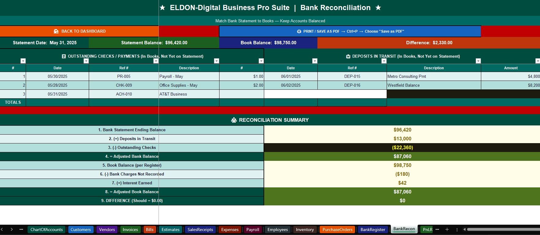 Bank Reconciliation -Reconcile your accounts to $0.00 difference