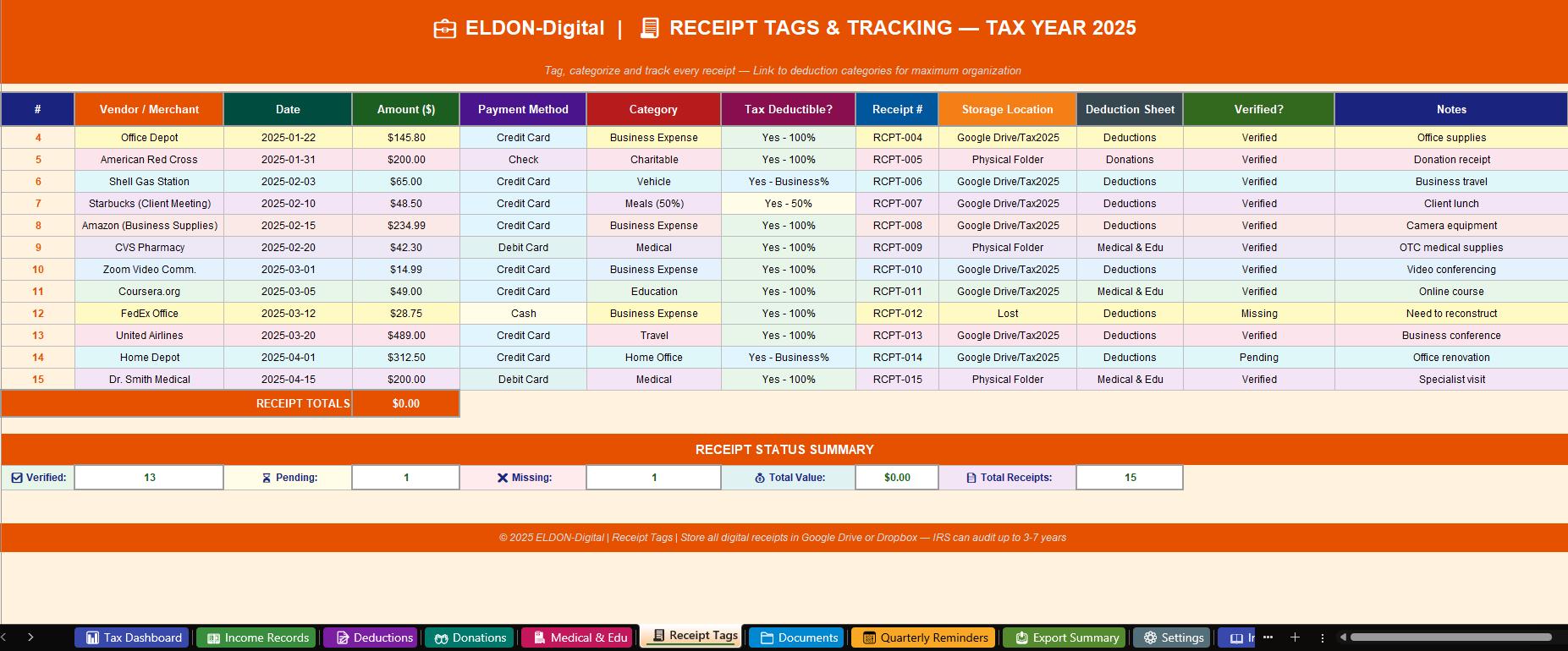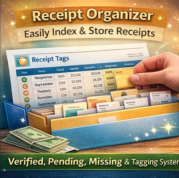 ๐งพ 6. Receipt Tags -Your digital receipt filing cabinet! Tag every receipt with vendor, date, amount, category, payment method, and storage location. Color-coded by status: โ