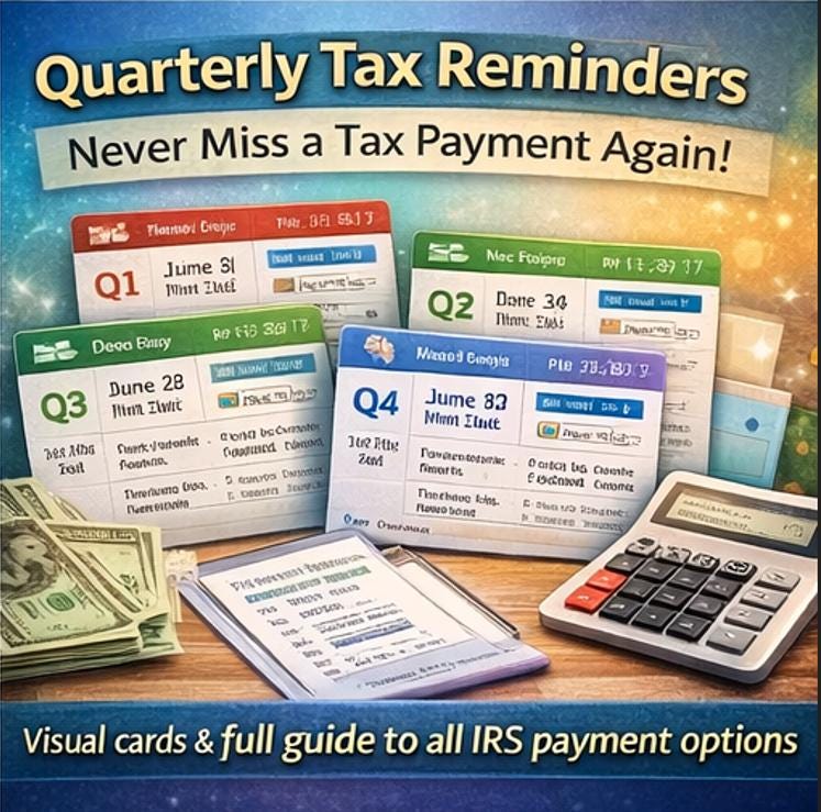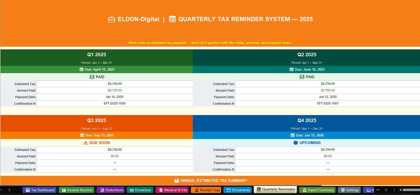 8. Quarterly Tax Reminder System -Beautiful visual cards for all 4 quarterly estimated tax payments. Shows Q1โQ4 due dates, estimated amounts, paid amounts, payment dates, confirmation numbers, and status. Includes an annual summary table and a full guide to all 5 IRS payment methods (Direct Pay, EFTPS, IRS2Go app, check, credit card) ๐ณ