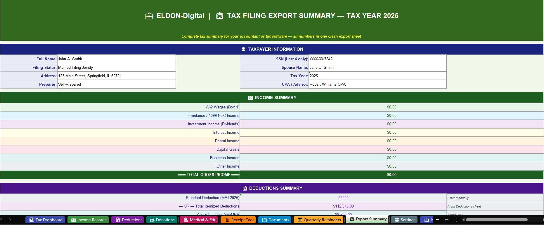 ๐ค 9. Export Summary -Your CPA's favorite sheet! This auto-populating export pulls all your numbers from every other sheet into one clean, printable summary. Shows income by type, deductions by category, deductible medical, education expenses, estimated tax calculation, self-employment tax, estimated balance due or refund, and effective tax rate. Simply share this one sheet with your accountant ๐จ๏ธ