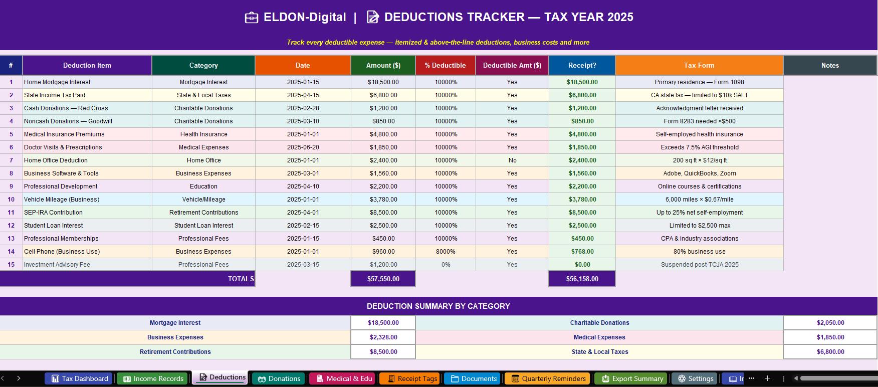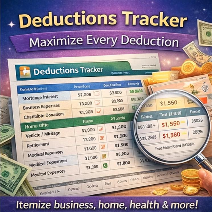 ๐ 3. Deductions Tracker -Never leave money on the table again! Record all deductible expenses -mortgage interest, charitable donations, medical, business expenses, home office, vehicle/mileage, retirement contributions, student loan interest, and more. Auto-calculates the deductible amount using your % deductibility input. Category summary shows your biggest deductions at a glance ๐ฏ