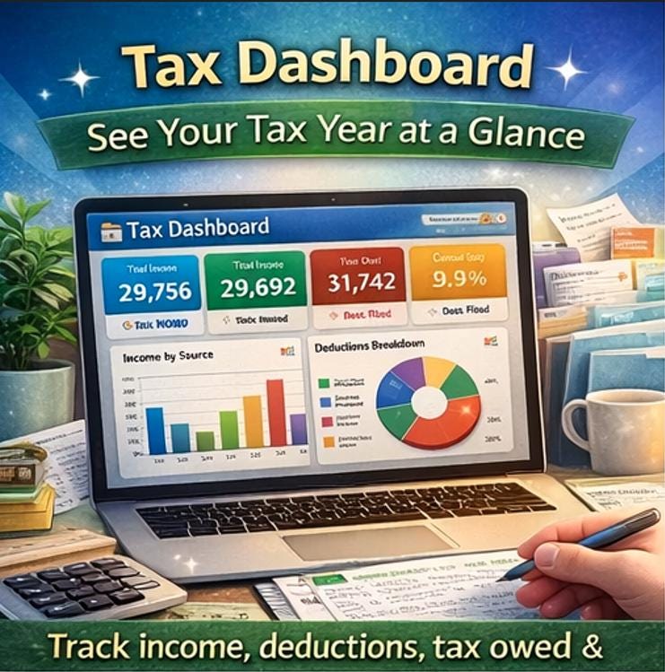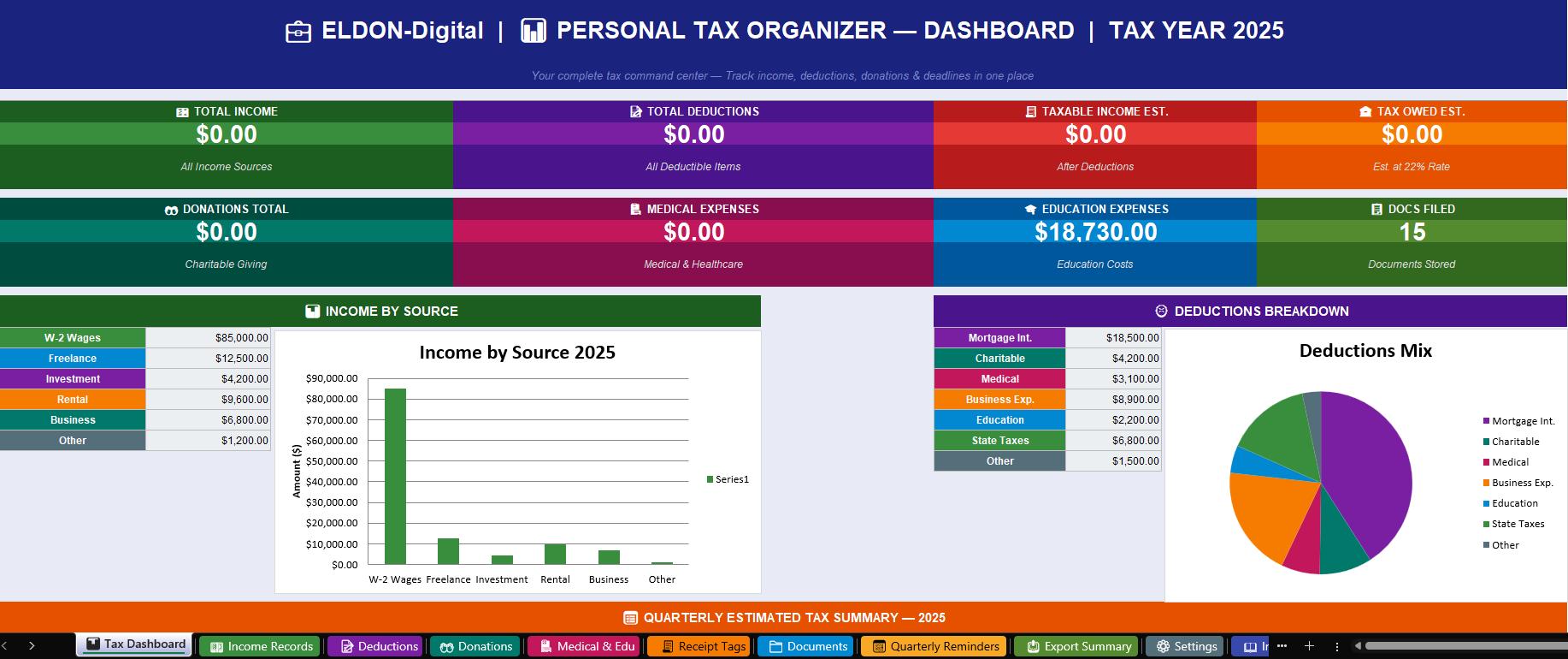 ๐ 1. Tax Dashboard -Your complete financial overview at a glance! Stunning KPI cards show Total Income, Total Deductions, Estimated Taxable Income, Estimated Tax Owed, Total Donations, Medical Expenses, Education Costs, and Documents Filed -all automatically updated from your data. Includes a bar chart for Income by Source, a pie chart for Deductions Breakdown, a full Quarterly Tax Tracker, and a Deadline Alert table so you never miss a filing date