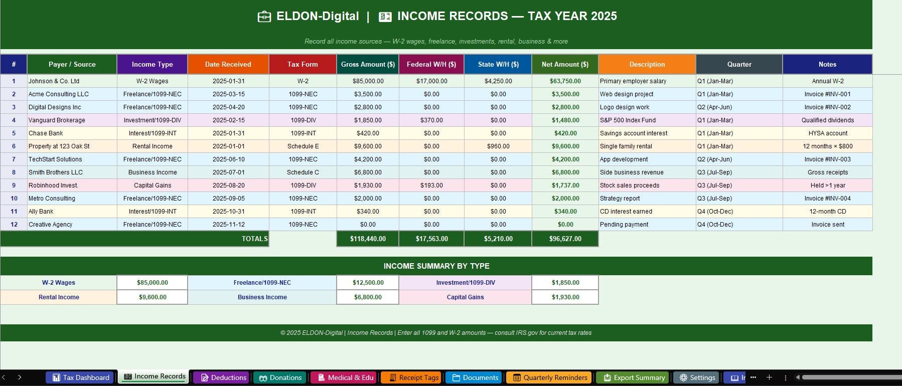 ๐ต 2. Income Records -Log every income source in one organized table: W-2 wages, freelance 1099-NEC, investment dividends, interest income, rental income, capital gains, business income, and more. Smart dropdowns for Income Type, Tax Form, and Quarter. Auto-calculates Net Amount after withholding. Summary by income type at the bottom ๐