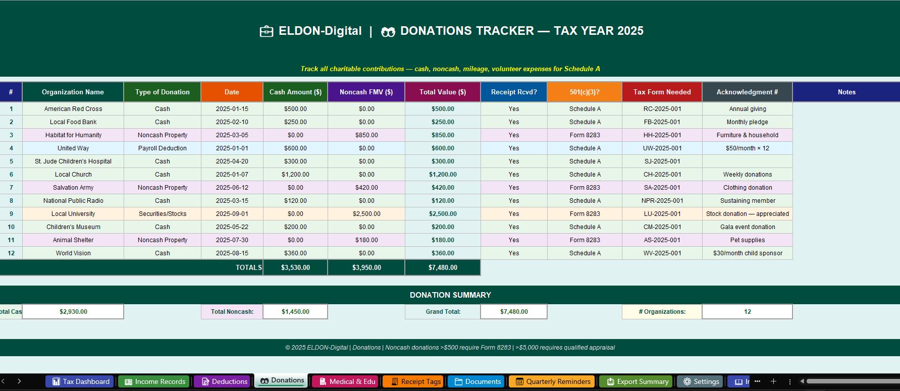 ๐คฒ 4. Donations Tracker -Track every charitable gift with the precision the IRS requires. Logs cash donations, noncash property, payroll deductions, and stock/securities donations. Auto-calculates total value and flags when Form 8283 is required. Includes acknowledgment number tracking for donations over $250 โจ