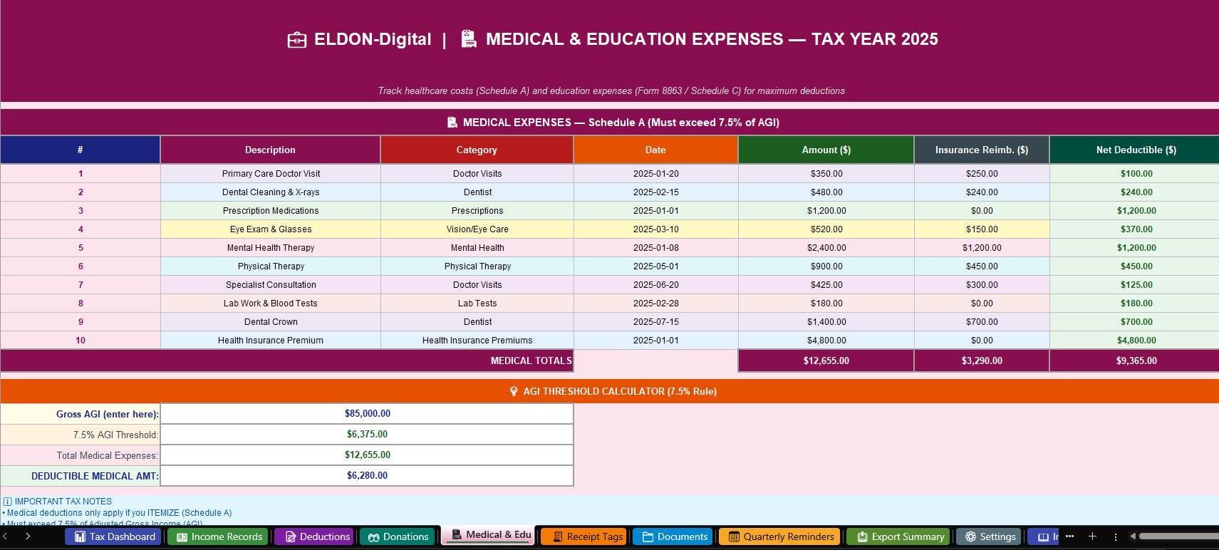 ๐ฅ 5. Medical & Education Expenses -Two powerful sections in one sheet. The Medical section includes a built-in AGI Threshold Calculator that automatically shows your actual deductible amount after the 7.5% floor. The Education section tracks tuition, books, online courses, and certifications -with credit type labels for American Opportunity and Lifetime Learning credits ๐