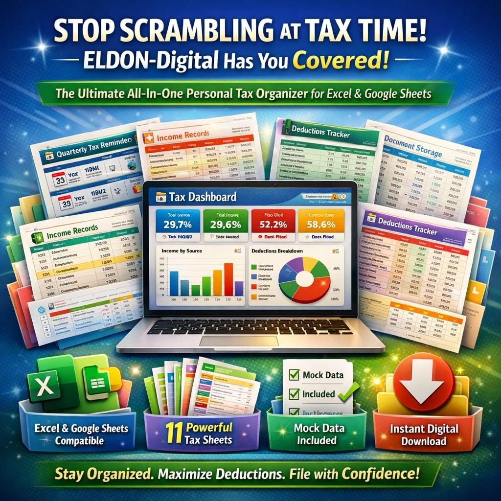 ๐ก There's a better way. The ELDON-Digital Personal Tax Organizer is a professionally built, beautifully designed spreadsheet system that keeps every income record, deduction, receipt, and deadline organized year-round -so tax season becomes just another week, not a month of stress. ๐ช