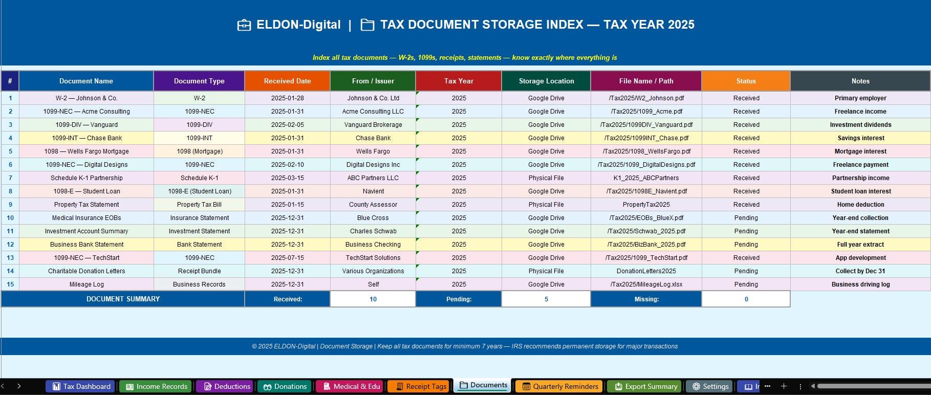 ๐ 7. Document Storage Index -Never wonder "where did I put my W-2?" again. Index every tax document you receive -W-2s, all 1099 forms, Form 1098 (mortgage), 1098-E (student loan), 1098-T (education), K-1s, investment statements, and more. Records issuer, date received, file path, and status (Received / Pending / Missing / Filed) ๐๏ธ