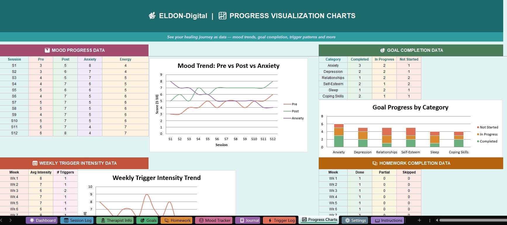 π 9. Progress Visualization Charts -Four stunning auto-updating charts that transform your healing data into a visual story: Mood Trend (Pre vs. Post vs. Anxiety across 12 sessions), Goal Progress by Category (stacked bar), Weekly Trigger Intensity Trend (line chart), and Homework Completion by Week (stacked bar). Print this sheet monthly and bring it to sessions -visual progress is one of the most motivating things a client can see π